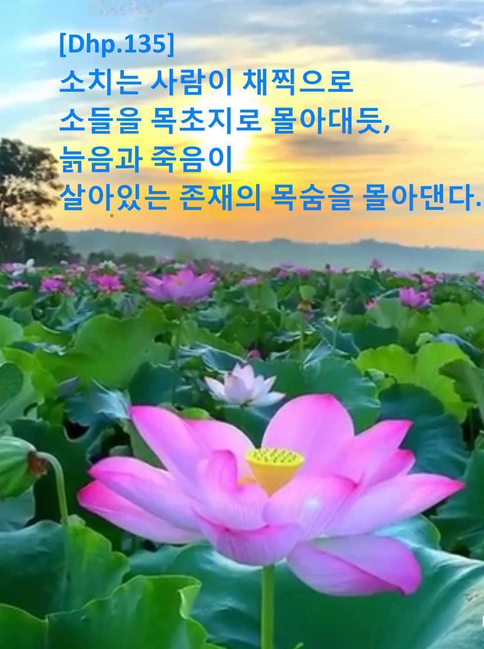 “위사카여, 뭇삶에게는 태어나고, 늙고, 병들고, 죽는 것이 소치는 사람이 손에 몰이막대를 쥔 것과 같다. 태어남은 늙음으로 내몰고, 늙음은 병듦으로 내몰고, 병듦은 죽음으로 내몬다. 마침내 도끼로 자르듯 목숨을 끝낸다. 그럼에도 불구하고 태어남에서 벗어남을 구하는 자는 없다. 그들이 구하는 것은 모두 다시 태어남이다.”
