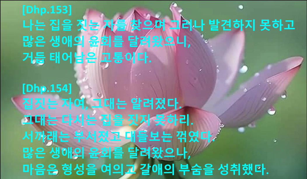 ▣ 집을 짓는 자 : 집은 인간을 구성하는 네 가지 원소, 즉 지수화풍(地水火風)의 사대(四大)와 오온(五蘊)을 가리킨다. 그리고 집을 짓는 자, 즉 목수는 욕망, 갈망, 애착, 집착 따위를 비유하신 것이다.